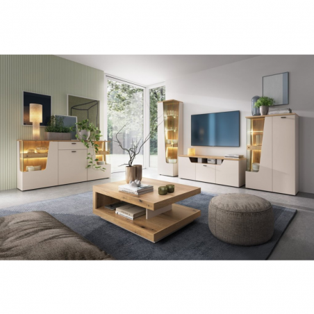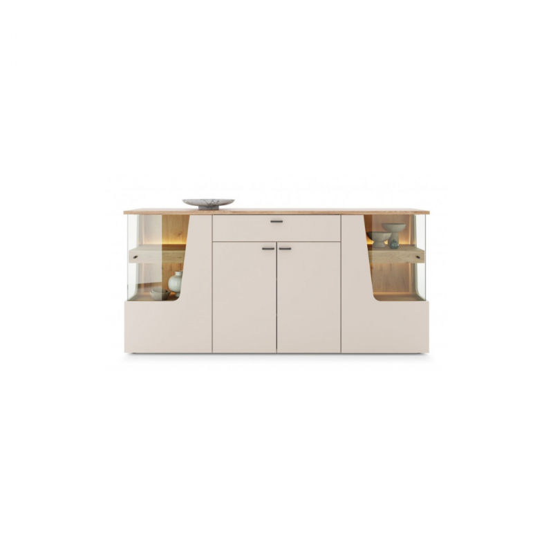 Komoda CUT OUT CTUK02 to doskonały wybór dla osób ceniących elegancki minimalizm i praktyczne rozwiązania w aranżacji wnętrz. Jej nowoczesna forma, subtelne kolory i przemyślane detale sprawiają, że z łatwością odnajdzie się w salonie.Połączenie dekoru kaszmir z naturalnym odcieniem dębu coast evoke nadaje komodzie wyjątkowego charakteru – ciepłego, a zarazem nowoczesnego. Geometryczne linie oraz efektowne wstawki z hartowanego szkła tworzą kompozycję, która dodaje lekkości i nowoczesnej elegancji każdemu wnętrzu.