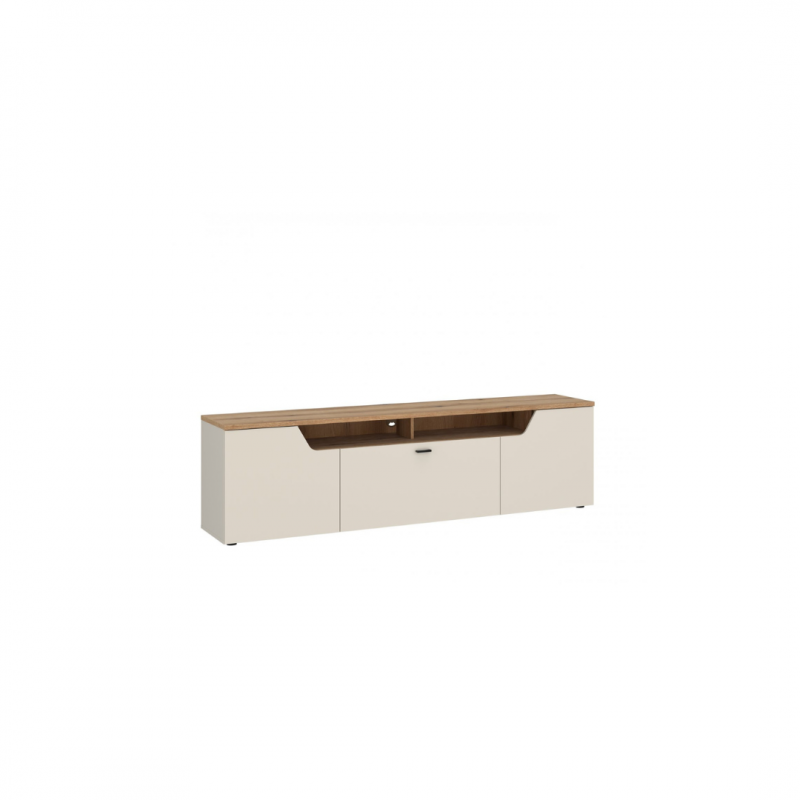 Komoda ma szerokość 195 cm, wysokość 56,5 cm oraz głębokość 45 cm, co zapewnia wystarczającą przestrzeń do przechowywania różnorodnych sprzętów multimedialnych, bez rezygnacji z estetyki wnętrza. Wykonana z wysokiej jakości płyty wiórowej laminowanej, jest solidna, trwała i łatwa do utrzymania w czystości. Zestawienie dekoru w kolorze kaszmir z dekorem dąb coast evoke tworzy harmonijną, ciepłą kompozycję, która nadaje wnętrzu przytulności i elegancji.