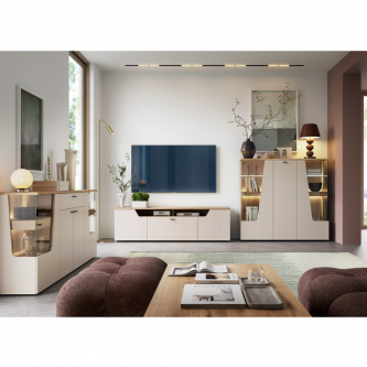 Komoda RTV jest meblem stojącym, wyposażonym w dwoje uchylnych drzwi oraz jedną klapę, co pozwala na wygodne przechowywanie akcesoriów RTV – takich jak płyty DVD, piloty, kontrolery – oraz innych drobnych przedmiotów codziennego użytku. Zastosowany mechanizm cichego domyku zapewnia komfort użytkowania, eliminując trzaski i podkreślając nowoczesny charakter mebla.