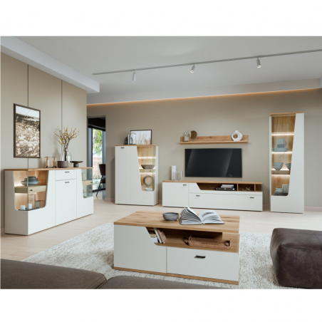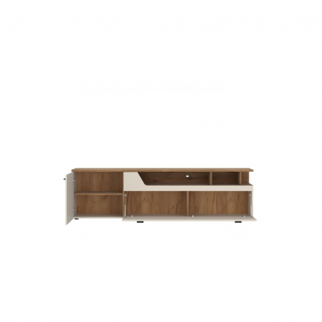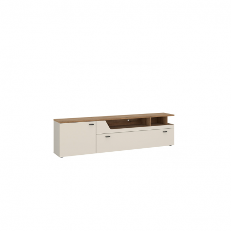 O wymiarach 210 cm szerokości, 58 cm wysokości i 42 cm głębokości, komoda idealnie sprawdzi się w mniejszych pomieszczeniach, oferując jednocześnie wiele miejsca na sprzęt audiowizualny oraz inne akcesoria. Dzięki 1 drzwiom i 1 klapie, możesz łatwo utrzymać porządek, jednocześnie eksponując to, co najważniejsze.