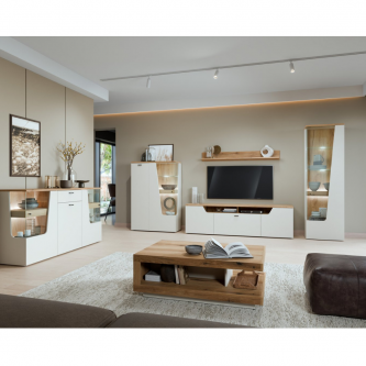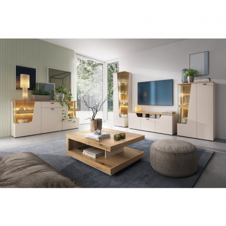 Stolik CUT OUT Typ LYOT01 to propozycja, która idealnie odnajdzie się w nowoczesnym salonie – szczególnie tam, gdzie ważna jest funkcjonalność, ale też przyjemność patrzenia na dobrze zaprojektowany mebel. Jego forma jest nieoczywista – prosta w założeniu, ale z subtelnym asymetrycznym przesunięciem, które nadaje całej konstrukcji lekkość i nowoczesny rytm. Zestawienie ciepłego dekoru dąb coast evoke z kolorem kaszmir sprawia, że stolik łatwo dopasować do wielu aranżacji – od jasnych i skandynawskich, po te bardziej stonowane i minimalistyczne.