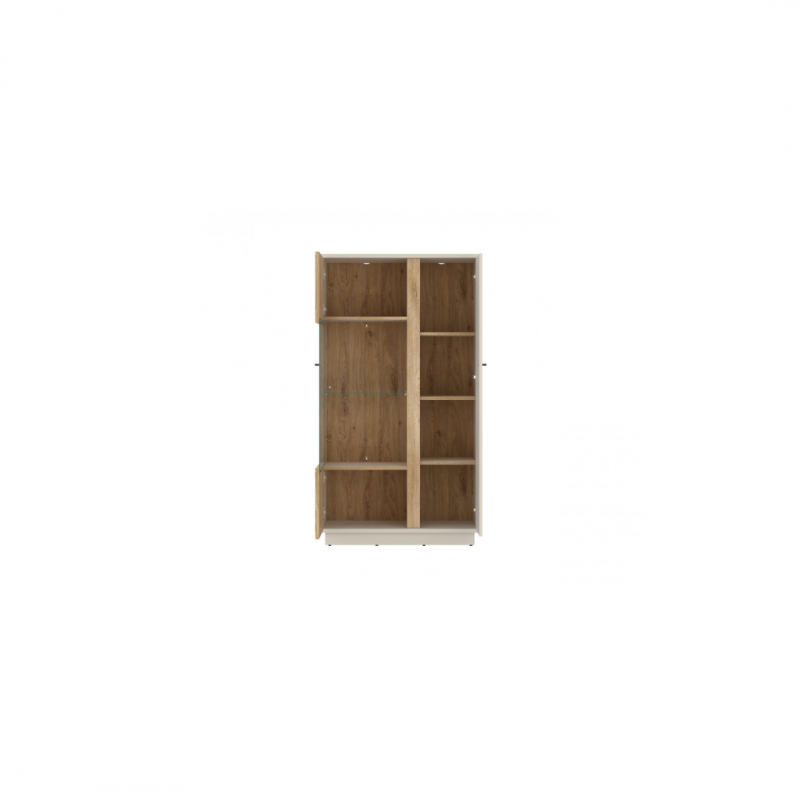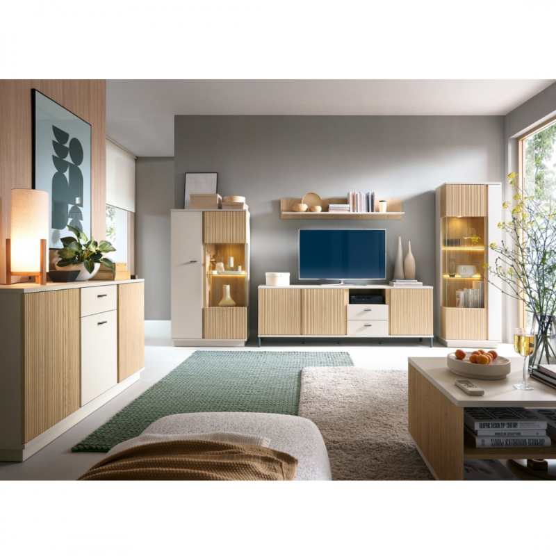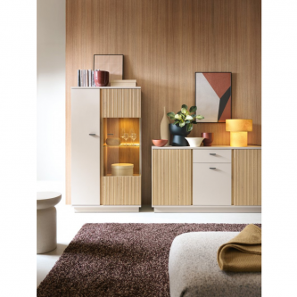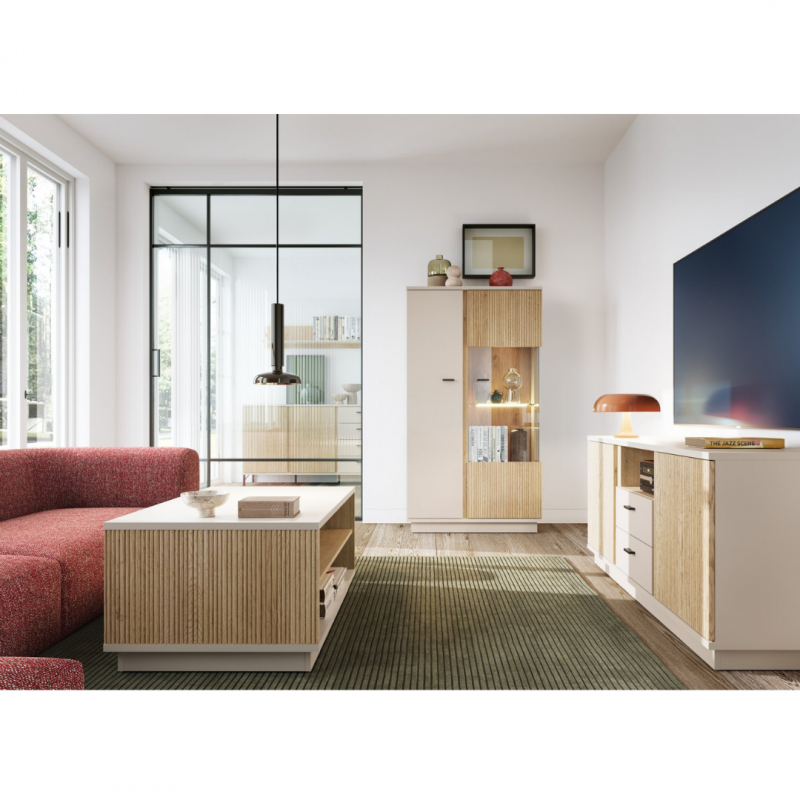 Kolekcja MOSANO to ukłon w stronę nowoczesnego designu z domowym charakterem. Witryna LUSV102 zachwyca przeszklonym bokiem, ryflowanym frontem w dekorze dębu cremona i wykończeniem w modnym kolorze kaszmiru. Subtelna, ale wyrazista – świetnie odnajdzie się zarówno w minimalistycznych, jak i bardziej przytulnych aranżacjach. Ten mebel z łatwością dopasujesz do różnych przestrzeni – od salonu po jadalnię – tworząc harmonijną i elegancką całość.