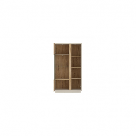Witryna ma 87,2 cm szerokości, 158,5 cm wysokości i 40 cm głębokości, więc bez problemu zmieści się także w mniejszych wnętrzach. Wnętrze podzielono na praktyczne strefy – szklane półki w części przeszklonej idealnie nadają się do wyeksponowania porcelany, pamiątek lub książek, a za pełnymi frontami znajdziesz sporo miejsca na mniej reprezentacyjne drobiazgi. Ryflowany front z dekoru dąb cremona (płyta MDF) nie posiada uchwytów – drzwi otwierają się dzięki eleganckiemu podfrezowaniu, które tworzy z meblem spójną i nowoczesną całość. Kaszmirowy front dopełnia kompozycję metalowym uchwytem w kolorze antracytu. Oba skrzydła wyposażono w system cichego domykania, co zapewnia komfort i płynność użytkowania. Dodatkowym atutem jest możliwość zamontowania oświetlenia LED – to opcja, która podkreśli zawartość i doda przytulności po zmroku.