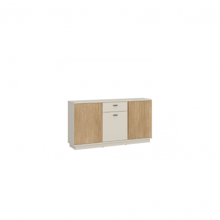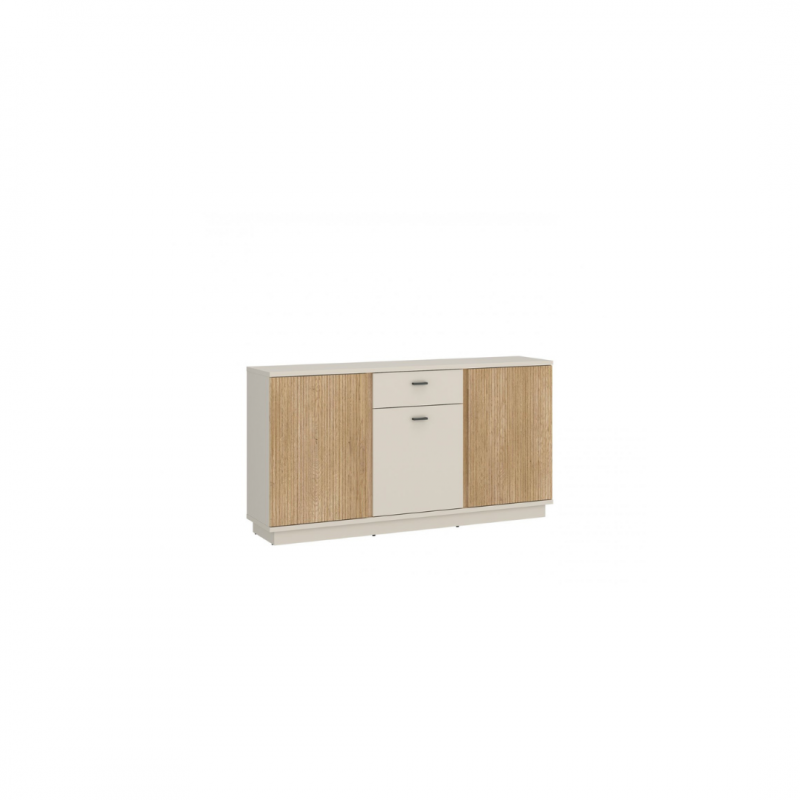 Mebel mierzy 150 cm szerokości i 40 cm głębokości, a jego funkcjonalne wnętrze zostało zaprojektowane z myślą o wygodnym przechowywaniu. Trzy zamykane szafki pomieszczą sporo domowych drobiazgów, a centralna szuflada to idealne miejsce na rzeczy, które lubisz mieć pod ręką. Zarówno drzwi, jak i szuflada wyposażone są w system cichego domyku – codzienne użytkowanie staje się dzięki temu bardziej komfortowe i bezszelestne. Uwagę zwracają detale: drzwi nie mają uchwytów – otwierają się za pomocą subtelnego podfrezowania, które jest zintegrowane z ryflowanym frontem, natomiast jedyny uchwyt, wykonany z metalu w kolorze antracytu, umieszczono na szufladzie. Korpus komody to wytrzymała płyta laminowana, a fronty – solidny MDF połączony z płytą wiórową.