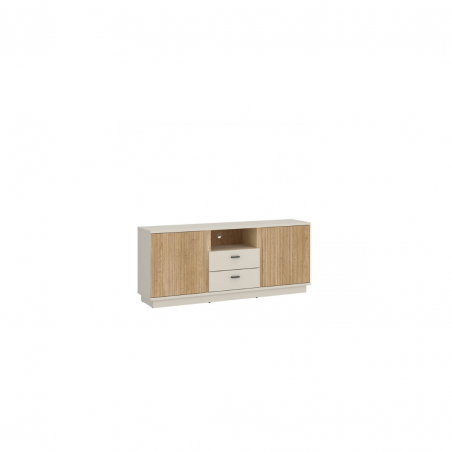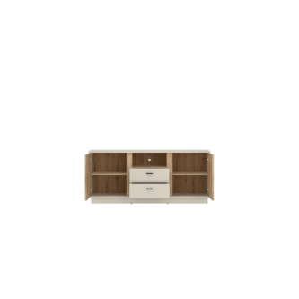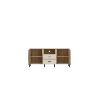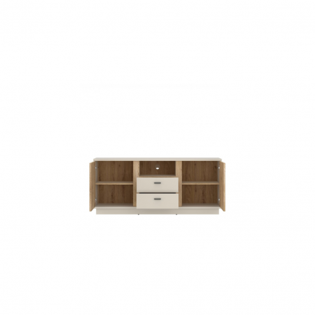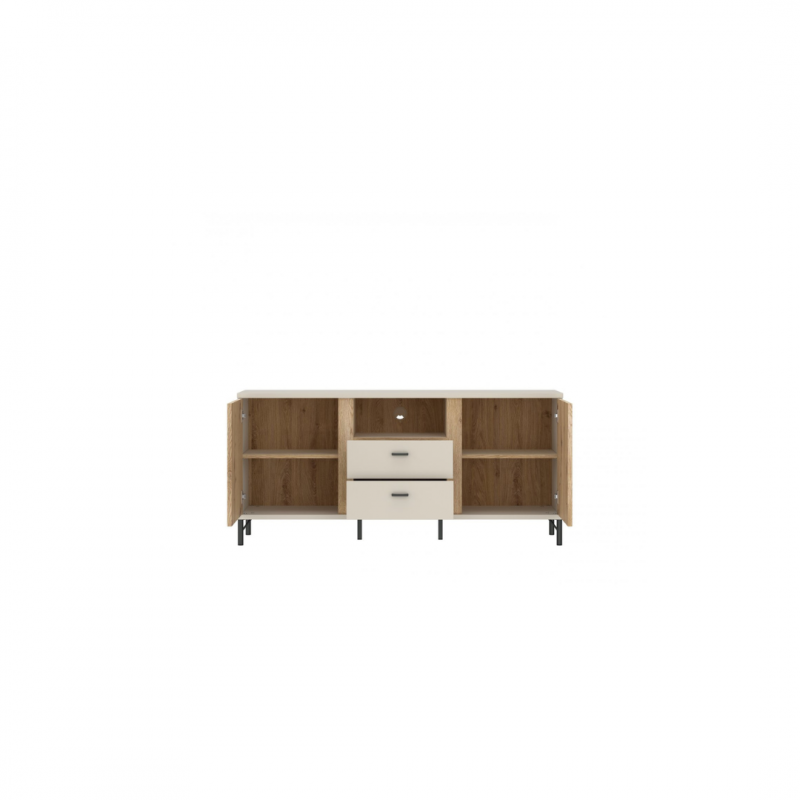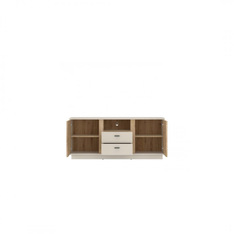 W środku znajdziesz wszystko, czego potrzeba, by uporządkować domową elektronikę. Dwie szafki z drzwiami otwieranymi za pomocą delikatnego podfrezowania ukryją wszystkie niezbędne akcesoria, a dwie centralnie umieszczone szuflady z metalowymi uchwytami w kolorze antracytu świetnie sprawdzą się na piloty, ładowarki czy dokumenty. Pomiędzy nimi znalazła się otwarta półka na dekoder lub konsolę. Wszystkie fronty wyposażone są w system cichego domyku, dzięki czemu mebel pracuje płynnie i bezgłośnie. Korpus wykonany jest z trwałej płyty laminowanej, a fronty z MDF i płyty wiórowej – to połączenie, które gwarantuje zarówno estetykę, jak i trwałość.