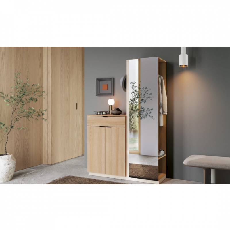 Centralnym akcentem kompozycji jest wysokie lustro, które natychmiast powiększa optycznie przestrzeń i wprowadza do wnętrza dodatkową porcję światła – szczególnie cenną w przedpokojach pozbawionych okna. Za dwuskrzydłowymi drzwiami kryją się ustawne półki, pozwalające schować buty, torebki czy pudełka z akcesoriami, a praktyczna szuflada ułatwia segregowanie drobiazgów, które zwykle gubią się przy wyjściu z domu. Obok części zamykanej znajduje się pionowy panel z dwoma haczykami oraz drążek, na którym wygodnie odwiesisz płaszcze i kurtki tuż po przekroczeniu progu.