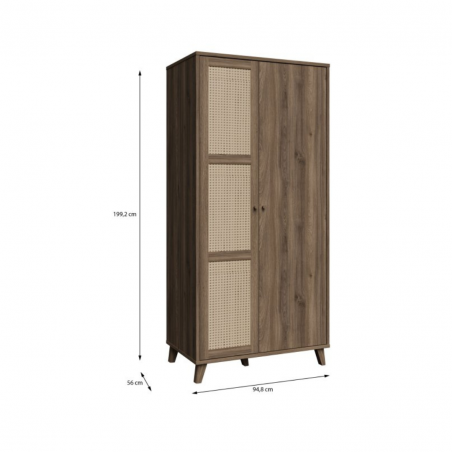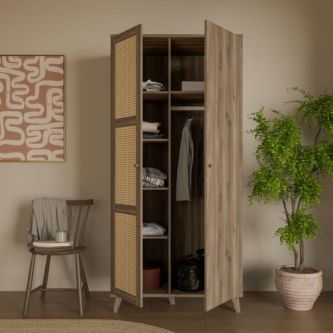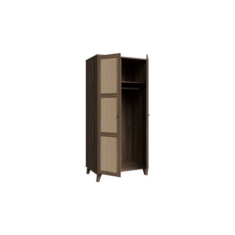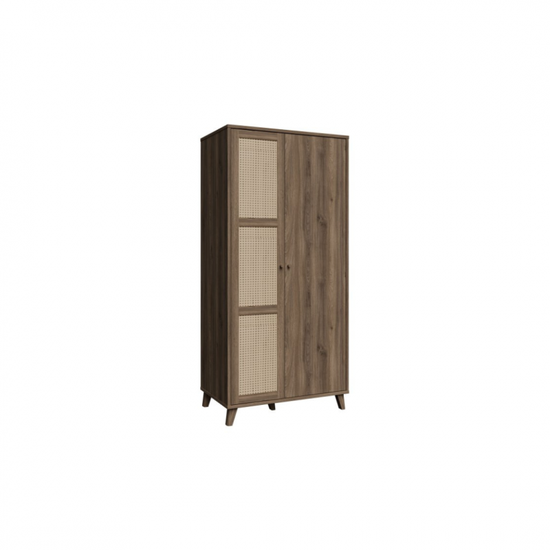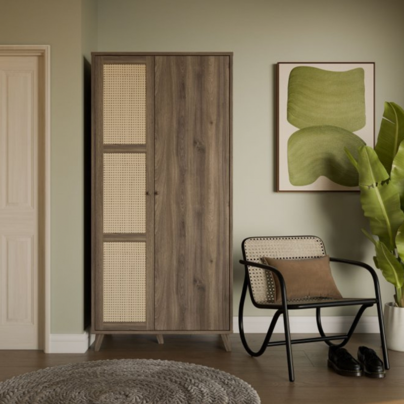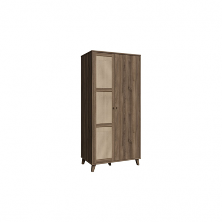 Szafa GLENKEEN, która łączy w sobie elegancję z funkcjonalnością, idealnie wpisując się w nowoczesne wnętrza. Jej dekor odzwierciedlający naturalne drewno dodaje ciepła i przytulności, a jednocześnie wprowadza do przestrzeni nowoczesny styl. Szafa posiada 6 pojemnych półek i drążek ubraniowy. Rattanowe fronty, które wprowadzają lekkość i subtelny akcent do aranżacji. Minimalistyczny design oraz staranne wykończenie sprawiają, że szafa jest nie tylko praktyczna, ale również stylowa. Sprawdzi się zarówno jako rozwiązanie do sypialni, jak i przedpokoju.
