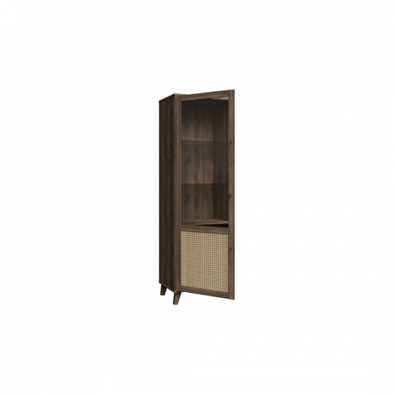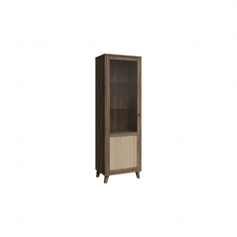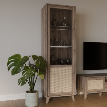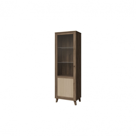 Witryna z kolekcji GLENKEEN, która łączy w sobie funkcjonalność i styl. Jej dekor odzwierciedlający naturalne drewno wprowadza przytulną atmosferę, tworząc harmonijną przestrzeń w każdym pomieszczeniu. Przezroczyste półki pozwalają na efektowne wyeksponowanie kolekcji kieliszków czy dekoracji, podczas gdy dolna część z rattanowym akcentem dodaje charakteru i lekkości. Dzięki tej witrynie zyskasz nie tylko miejsce do przechowywania, ale także stylowy element dekoracyjny, który przyciągnie wzrok każdego gościa. Dodatkowo, jej minimalistyczny design sprawia, że doskonale wpisuje się w różnorodne aranżacje – od nowoczesnych po klasyczne.