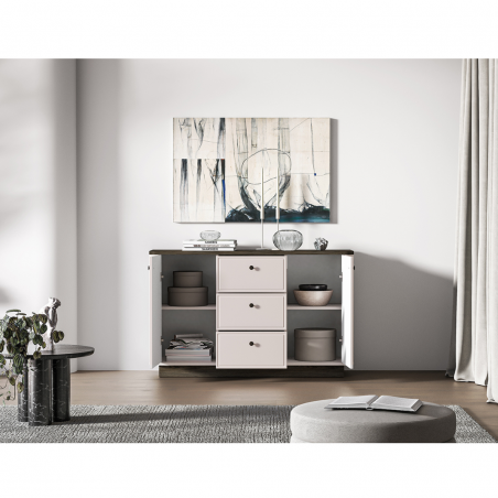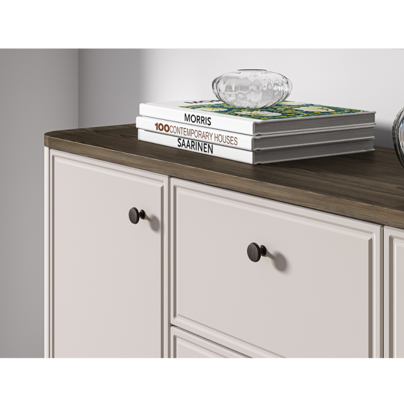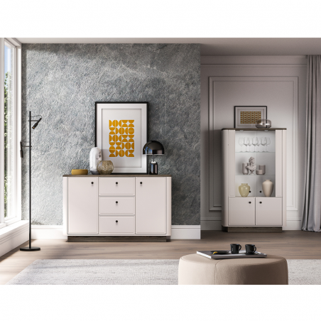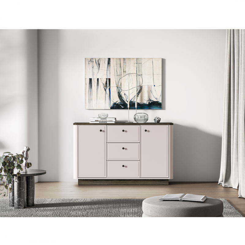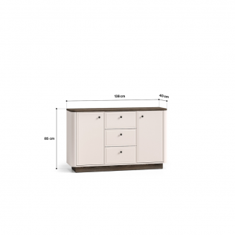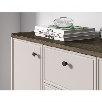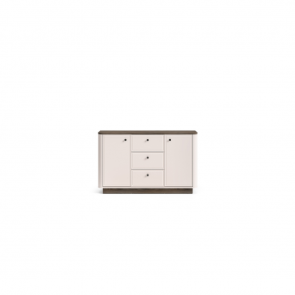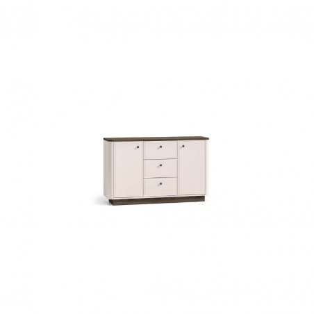 Meble Vilavio to wyjątkowo elegancka kolekcja do salonu czy sypialni. Bryły przyciągają uwagę pięknie zaoblonym przejściem między korpusem a frontami. Kontrastowe zestawienie dekorów – klasyczny kaszmirowy oraz ciemno barwiony dąb Windmill - podkreśla charakter mebli Vilavio. Drzwiczki oraz szuflady wykonane z płyty MDF z ozdobnym frezowaniem wskazują na wyrafinowany styl całej kolekcji. Gustowne, metalowe uchwyty dodają całości szyku i wysmakowania. Meble Vilavio wypełnią Twoje wnętrze wytwornością i finezyjną estetyką.