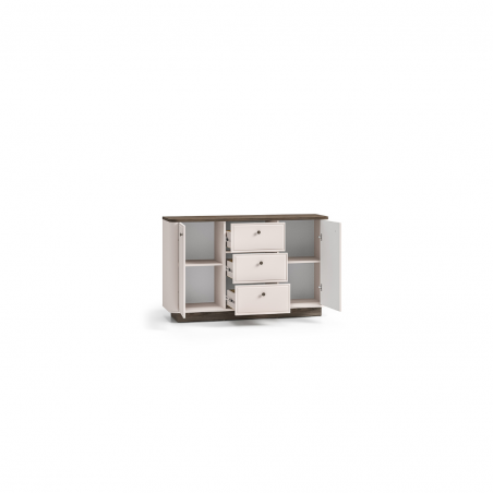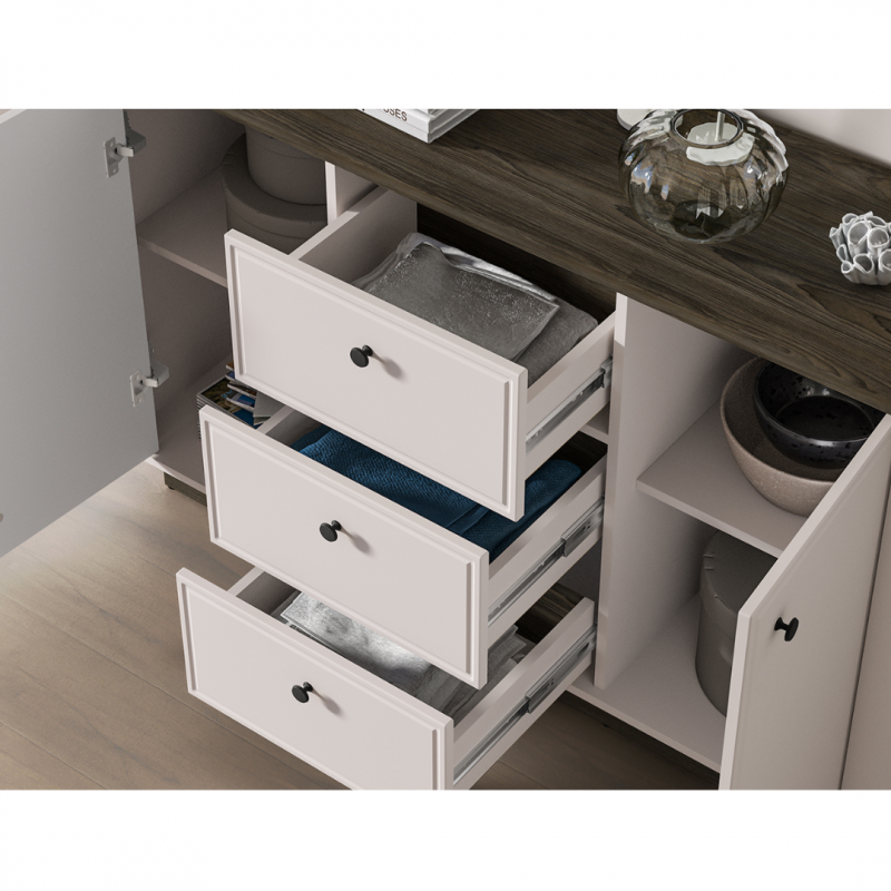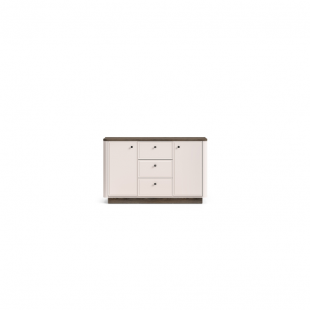 Średnia komoda Vilavio 04 to idealny mebel do przechowywania. Za obojgiem drzwi kryją się łącznie cztery pojemne wnęki. Przechowasz w nich ubrania, ręczniki czy pościel. Środek mebla tworzą trzy głębokie szuflady, które zapewnią odpowiednią ilość miejsca na dokumenty, obrusy lub inne domowe tekstylia. Komoda będzie świetnym dopełnieniem Twojego salonu lub sypialni. Szeroki blat będzie idealnym miejscem do wyeksponowania eleganckich wazonów, pamiątek z podróży lub innych ulubionych gadżetów. Wybierz komodę Vilavio i zachowaj porządek w swoim wnętrzu.