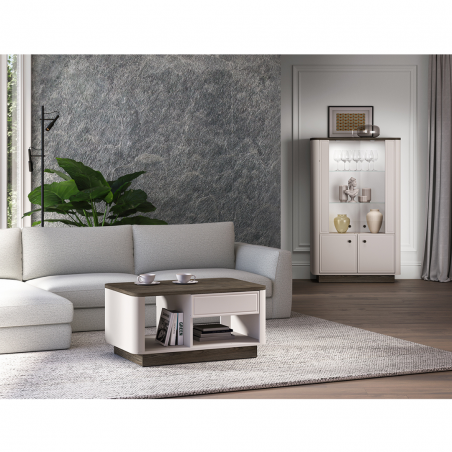 Meble Vilavio to wyjątkowo elegancka kolekcja do salonu czy sypialni. Bryły przyciągają uwagę pięknie zaoblonym przejściem między korpusem a frontami. Kontrastowe zestawienie dekorów – klasyczny kaszmirowy oraz ciemno barwiony dąb Windmill - podkreśla charakter mebli Vilavio. Drzwiczki oraz szuflady wykonane z płyty MDF z ozdobnym frezowaniem wskazują na wyrafinowany styl całej kolekcji. Gustowne, metalowe uchwyty dodają całości szyku i wysmakowania. Meble Vilavio wypełnią Twoje wnętrze wytwornością i finezyjną estetyką.