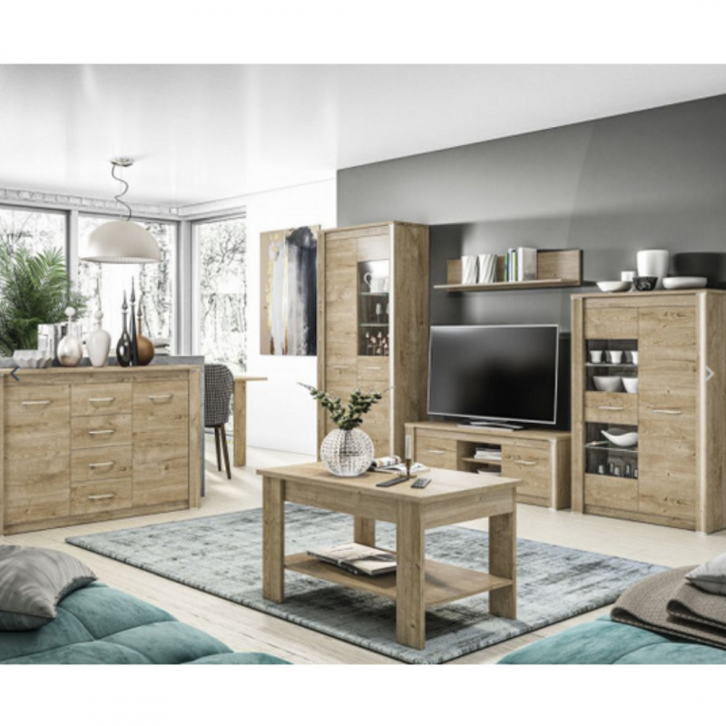 Szlachetny dekor jasnego dębu Ribbeck z dekoracyjnymi pionowymi listwami MDF podkreślają masywność oraz stabilność brył. Metalowe uchwyty oraz charakterystyczne wstawki w kolorze szampańskim nadają elegancji, blasku i spójności całej kolekcji. Meble Luis to trwałość i niezawodność podczas codziennego użytkowania. Dzięki szerokiej gamie brył z łatwością urządzisz swój salon lub jadalnię.